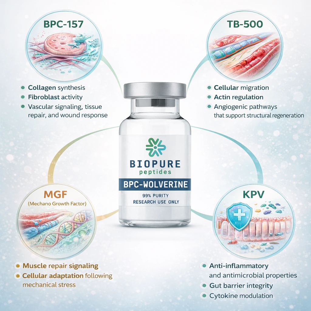 The Wolverine +KPV Peptide Blend is commonly referenced in research environments investigating tissue regeneration, immune balance, collagen production, and recovery mechanisms. By combining peptides with overlapping yet distinct biological pathways, this blend provides a versatile tool for controlled laboratory studies focused on structural tissue support and cellular maintenance.